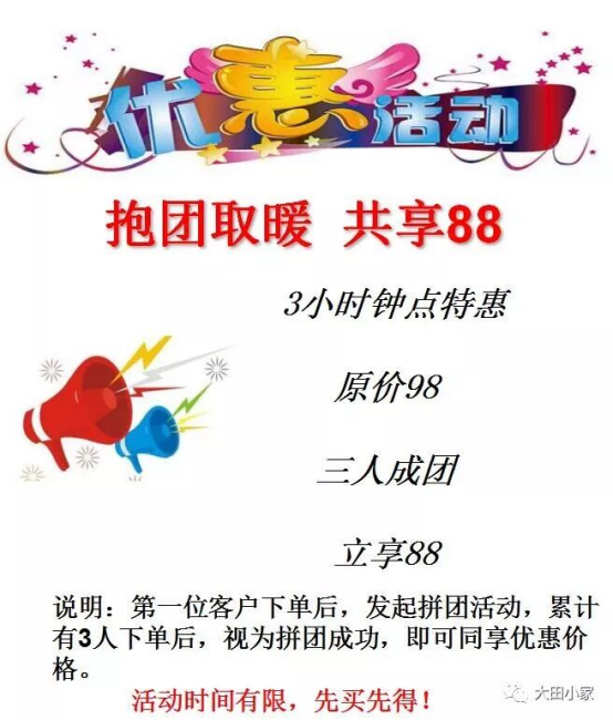 抱团取暖 共享88 作者 大田小家 03/11/2026 优惠活动 抱团取暖 共享88 3小时钟点特惠 原价98 三人成团 立享88 说明:第一位客户下单后,发起拼团活动,累计有3人下单后,视为拼团成功,即可同享优惠价格。 活动时间有限,先买先得! 优惠产品购买,请直接点击以下链接:抱团取暖 共享88(购买链接) 文章发布于:2018-03-20 大田小家官方微信